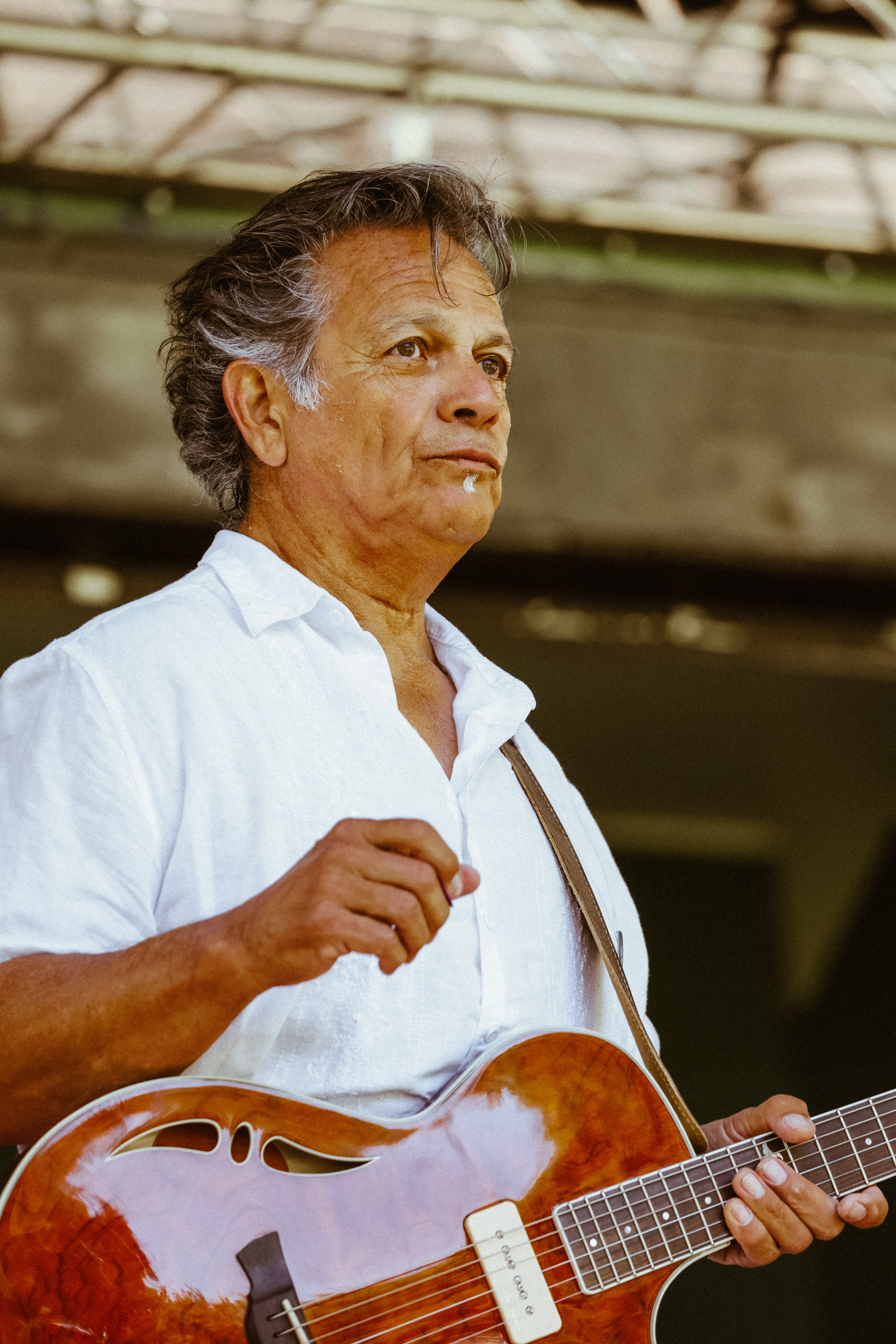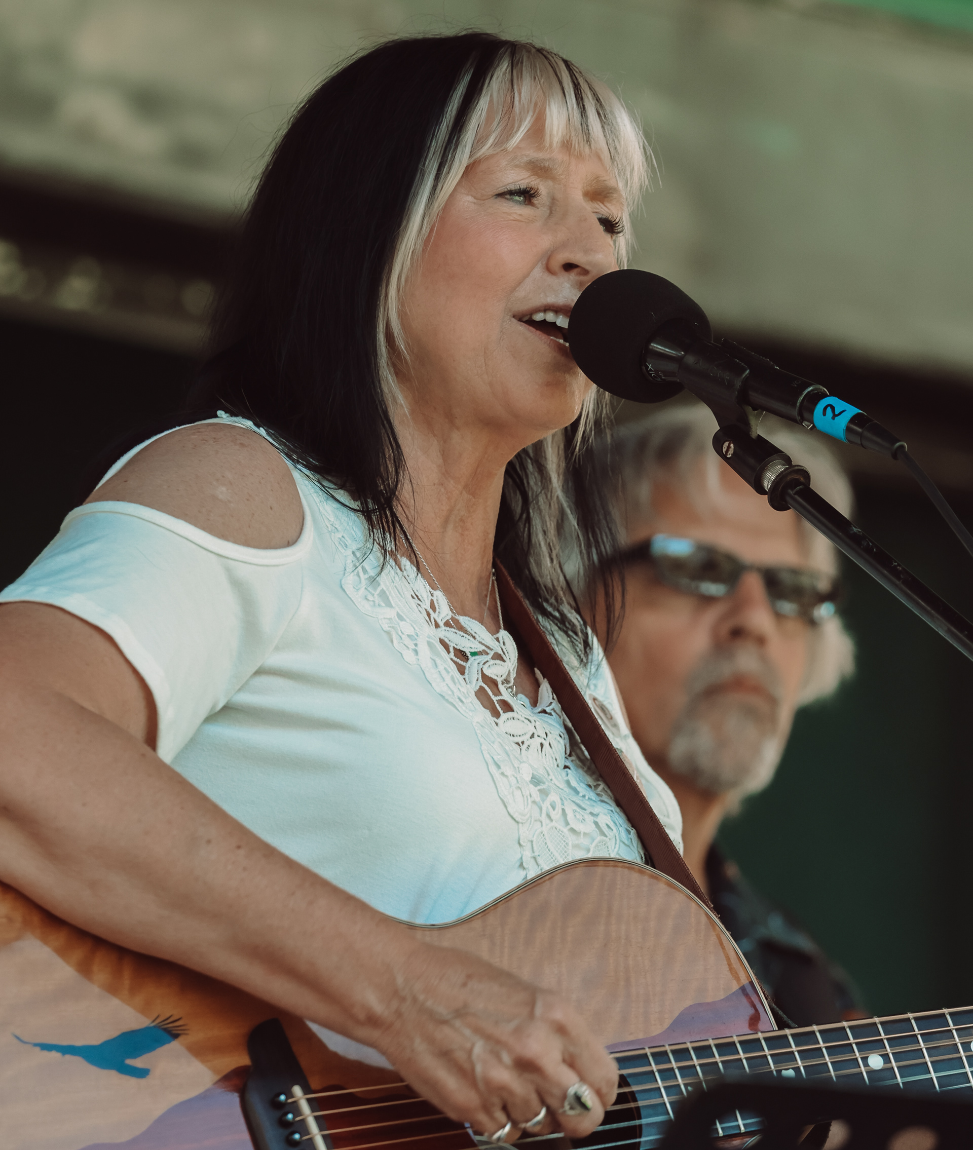 A musician plays guitar during a live performance at Howard Amon Park in Richland, Washington.